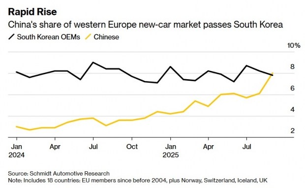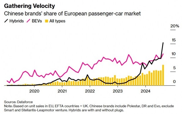 Лідерами стали BYD Co., MG (входить до SAIC Motor Corp.) та Chery Automobile Co., які вперше випередили південнокорейські бренди на кшталт Kia Corp.. Експерти зазначають, що таке зростання зумовлене підвищеним попитом на електричні та гібридні моделі. За даними аналітика Dataforce Бенджаміна Кібіса, рекордний результат свідчить про постійне зміцнення позицій китайських брендів на європейському ринку.
